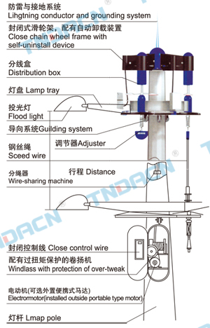 7.Guiding and break system: it is used to guide the lift of lamp panel,if the steel cable breaks, this can make break protection to preventthe lamp panel falling off. Guiding system can make the panel on themiddli position during the lift by nylon wheel to avoid panel crashingwith pole and damage the lamp pole. Break system can be 120°,theyare arranged for three groups, three break devices built in the lamppole, when the hanging steel cable strained again, break device canloose and the panel can lift again.When the steel cable is under therelief state,break device is locked all the time. Advanced liquid breaktechnology can prevent steel impact, strong break force without noise;